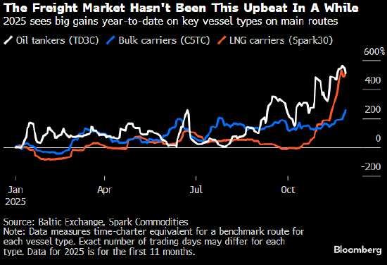 散货(包括谷物和矿石)运费基准指标在11月底升至20个月高点,原因是围绕几内亚一项大型铁矿项目即将投产的预期升温。而从更广角度来看,关键航线周边的冲突也推高了整体成本。